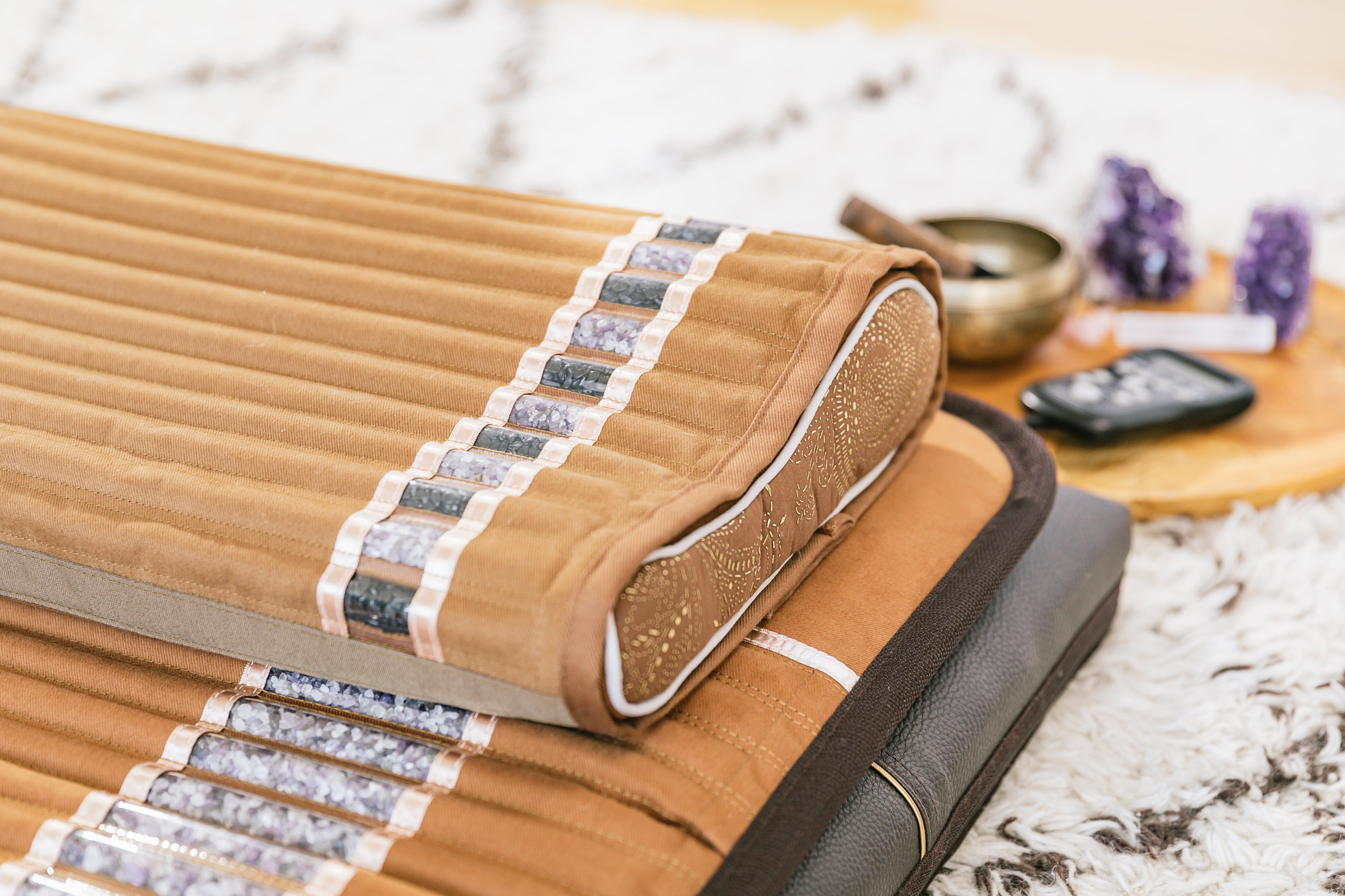 The Amethyst Pillow from Biomat keeps your head cool during heated infrared sessions, blending natural amethyst and black tourmaline crystals with ochre-infused memory foam for ultimate neck support and relation. It's non-electric, hypoallergenic, with a washable cotton cover-perfect for soothing headaches and boosting energy flow while you rest on the Biomat.